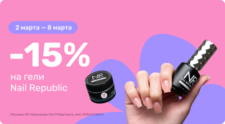 С 2 марта 00:00 по 8 марта 23:59 (время Мск) 2026г. -15% на гели Nail Republic!