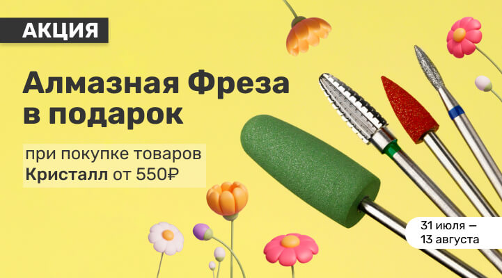 С 31 июля по 13 августа 2023г. при покупке товаров Кристалл от 550р. алмазная фреза Кристалл в подарок!