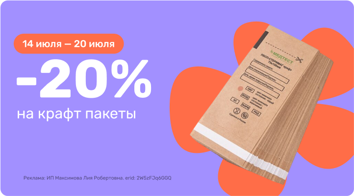 С 14 июля 10:50 по 20 июля 23:59 (время Мск) 2025г. скидка 20% на крафт-пакеты!