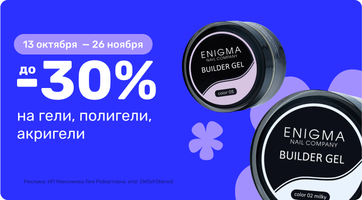 С 13 октября 00:00 по 26 октября 23:59 (время Мск) 2025г. скидки до 30% на гели, акригели и полигели!