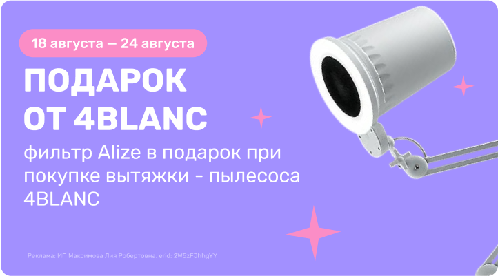 С 18 августа 00:00 по 24 августа 23:59 (время Мск) 2025г. фильтр в подарок при покупке вытяжки 4BLANC!