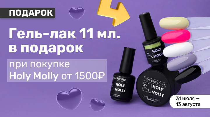 С 31 июля по 13 августа 2023г. при покупке товаров Holy Molly от 1500р. гель-лак 11мл. в подарок!
