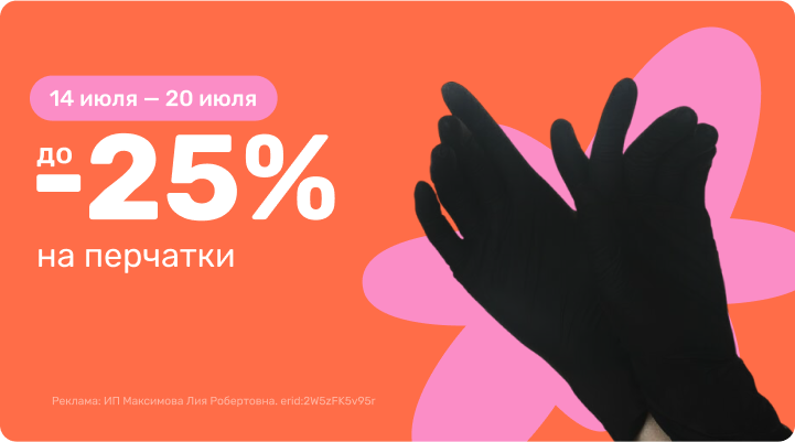 С 14 июля 11:10 по 20 июля 23:59 (время Мск) 2025г. скидки до -25% на перчатки!
