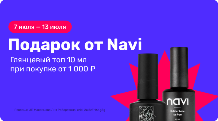 С 07 июля 00:00 до 13 июля 23:59 или до окончания подарков: Глянцевый топ 10 мл. в подарок при покупке товаров Navi от 1000 рублей