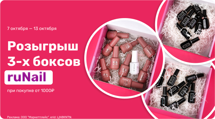 1. В период с 07 .10 00-01 по 13 .10.24 23:59 по МСК совершите и оплатите покупку от 1000 руб. товаров ruNail в нашем интернет-магазине. В розыгрыше участвуют заказы, оформленные и оплаченные ТОЛЬКО по 100% предоплате !