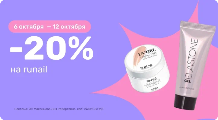 С 06 октября 00:00 по 12 октября 23:59 (время Мск) 2025г. скидка 20% на ruNail!